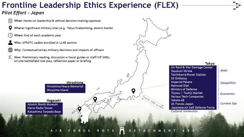 The Department of Air and Space Studies, in collaboration with Study Abroad, is developing an intensive, hands-on leadership experience focusing on ethics, geopolitics, and cultural considerations surrounding significant military battles around the world. By exploring sites in-person and re-enacting key battlefield decisions, cadets will vastly enhance their understanding of military actions shaping our history. As future officers, cadets will be call upon to lead a globally engaged force where their decision could have wide ranging ramifications. Dubbed FLEX, the “Front Line Ethics Experience” will enhance the students’ knowledge, skills, and attitudes as they prepare to be officers in the U.S. Air Force and U.S. Space Force