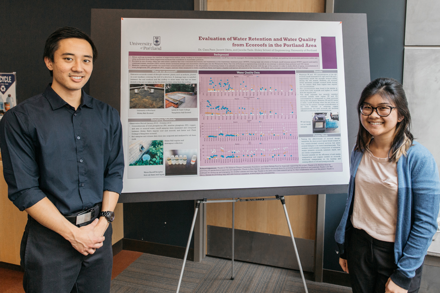 Cara Poor, civil engineering professor, and her team of two students, Jarrett Okita and Jocelle Tade, recently finished their project “Sustainability of Ecoroofs: An Evaluation of Runoff Water Quality from Ecoroofs in the Portland Area.” The team, along with a group from Lewis & Clark College, explored the cooling effect, water retention, and water quality of the ecoroofs atop University of Portland’s Shiley Hall and Lewis & Clark College’s Templeton Hall.