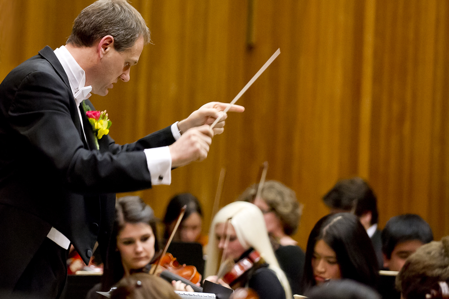 Along with his responsibilities as chair of the department, De Lyser is switching roles after eight years as director of the University’s orchestra, to directing the University Singers starting next fall. Leaving the orchestra will be hard. During one particular rehearsal for the orchestra’s February 27 concert featuring music from movie soundtracks De Lyser recalled, “The orchestra played the opening chord of ‘Star Wars’ and it was amazing and I got chills, and I thought ‘I can’t give this up!’” But he says that making the change is the right decision for him. Pursuing choral conducting is more in line with his current professional development and his work as a composer.