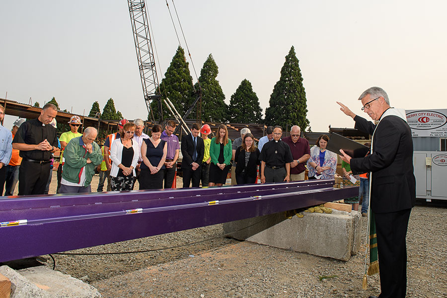 Last week members of the UP community gathered together to sign and bless a beam that will be part of the new Dundon-Berchtold Hall, currently under construction in the heart of the University’s campus. University President Rev. Mark L. Poorman, C.S.C., officiated at the blessing.