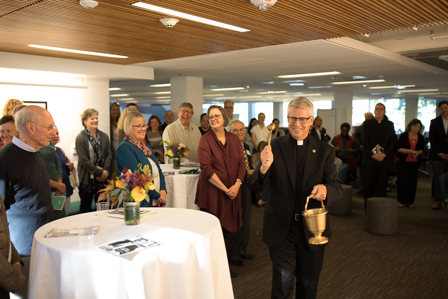 Photo: Rev. Mark L. Poorman C.S.C., President of the University of Portland, gives the blessing at the dedication ceremony of the new Dr. James T. Covert Gallery in the Clark Library.