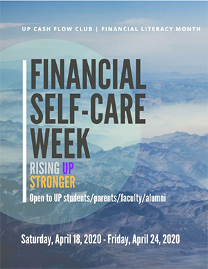 In honor of Financial Literacy Month, the UP Cash Flow Club has created a new, virtual series to help UP students, faculty, staff, parents, and alumni. The Financial Self-Care Week will run from Saturday, April 18, to Friday, April 24, with online workshops available once a day during the evening. These online workshops will cover a variety of topics including “Eating Healthy on a Budget,” “Planning for Retirement in the New Economy,” “Financial Aid,” and “Current Mortgage Rate Environment.” At the end of the week there will be a virtual session for students and graduating seniors to network with professionals in their prospective fields.