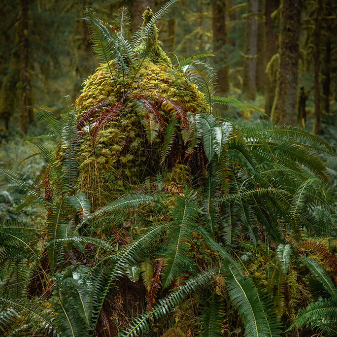 Bryant’s favorite place to shoot us Olympic National Park, a modern day Shangri-la on Washington’s Olympic Peninsula. The park encompasses close to a million acres, and within its borders exist multitudes, from mountains encrusted with glaciers to coastal zones dotted with tidal pools. Yet much as Yellowstone is known for thermal geysers and bison herds, Olympics renown rests on its temperate rain forest valleys. Those valleys are the wettest place in the continental US, receiving, on average, 10 to 12 feet of rain a year. That precipitation, combined with cool temperatures, nurtures a primeval realm comprised of a shrubby understory, dangling lichens, moss-draped bigleaf maple, and gargantuan Western hemlock and Sitka spruce. For more than 20 years, Bryant has trained his camera lens—and his eyes—on this park, paying special heed to its rain forests. He calls Olympic one of the world’s most beautiful places, and he swore, when I visited, I’d fall in love.