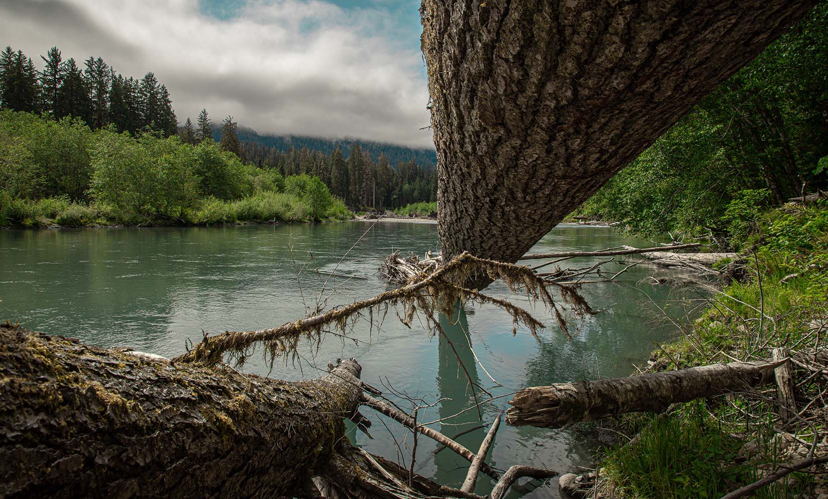 But for nearly every frustration, there came an equal, or greater, reward. Bryant wanted to ford the river in a different spot, to shoot one of his favorite water pools. We crossed, and bisecting the trail lay a downed red cedar, its trunk so massive we had to clamber around it. When I leaned in to examine the drying sapwood, its resinous aroma made me smile.