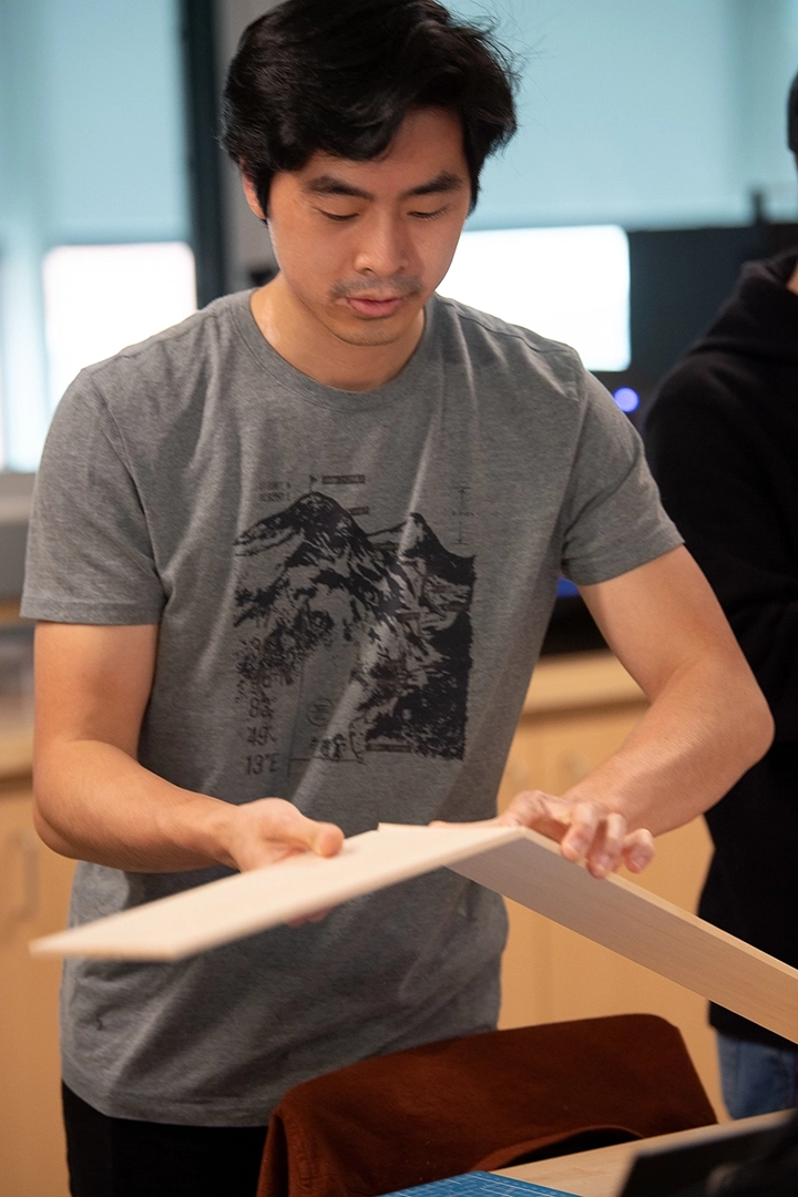 Donald’s Garage is the student-run maker space on the third floor. It is named after the space where engineer and inventor Donald Shiley, Class of 1951, kept his mill and lathe, where he would go to tinker, invent things, work with his hands, and bring an idea to life. In the new maker space there are, among other resources, laser printers, Glowforge laser cutters, engravers, 3D-design software, and a sewing machine.